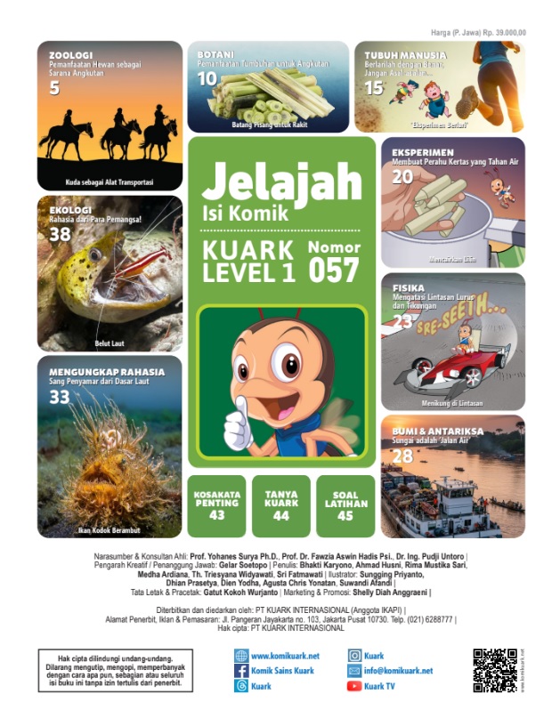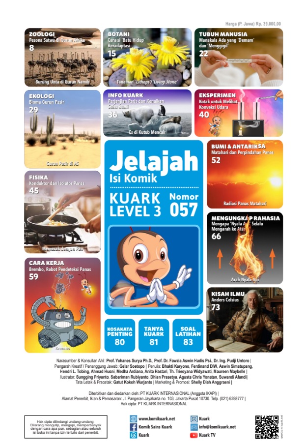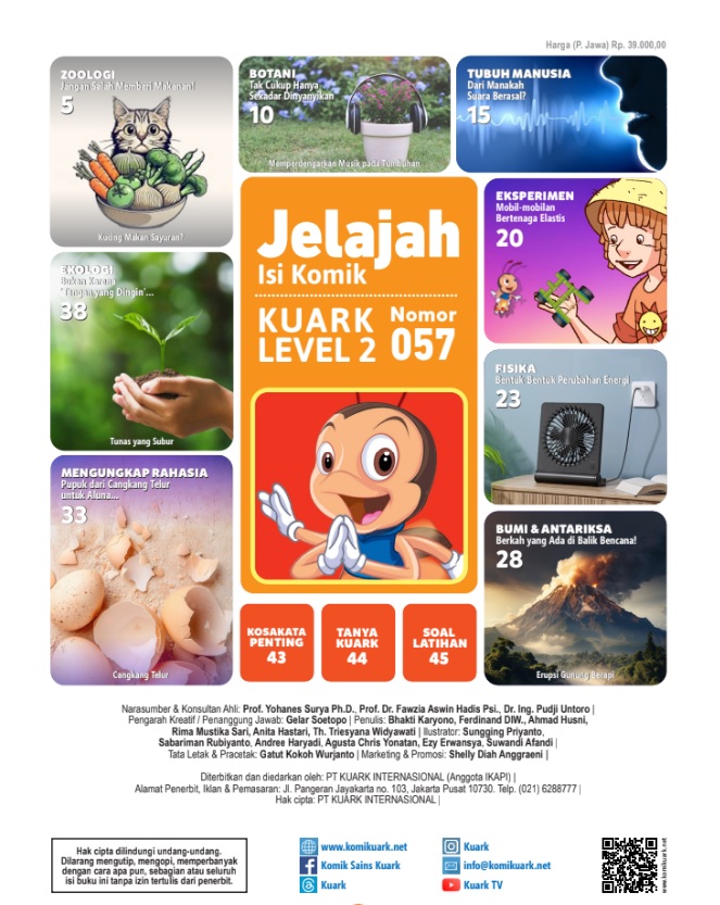Komik Sains Kuark menyajikan informasi sains dengan visualisasi yang apik, cerita yang menarik, dan bahasa yang mudah dimengerti. Tersedia juga eksperimen sains seru untuk mengasah kemampuan anak-anak untuk berpikir kritis melalui pengamatan, percobaan, dan analisis.
